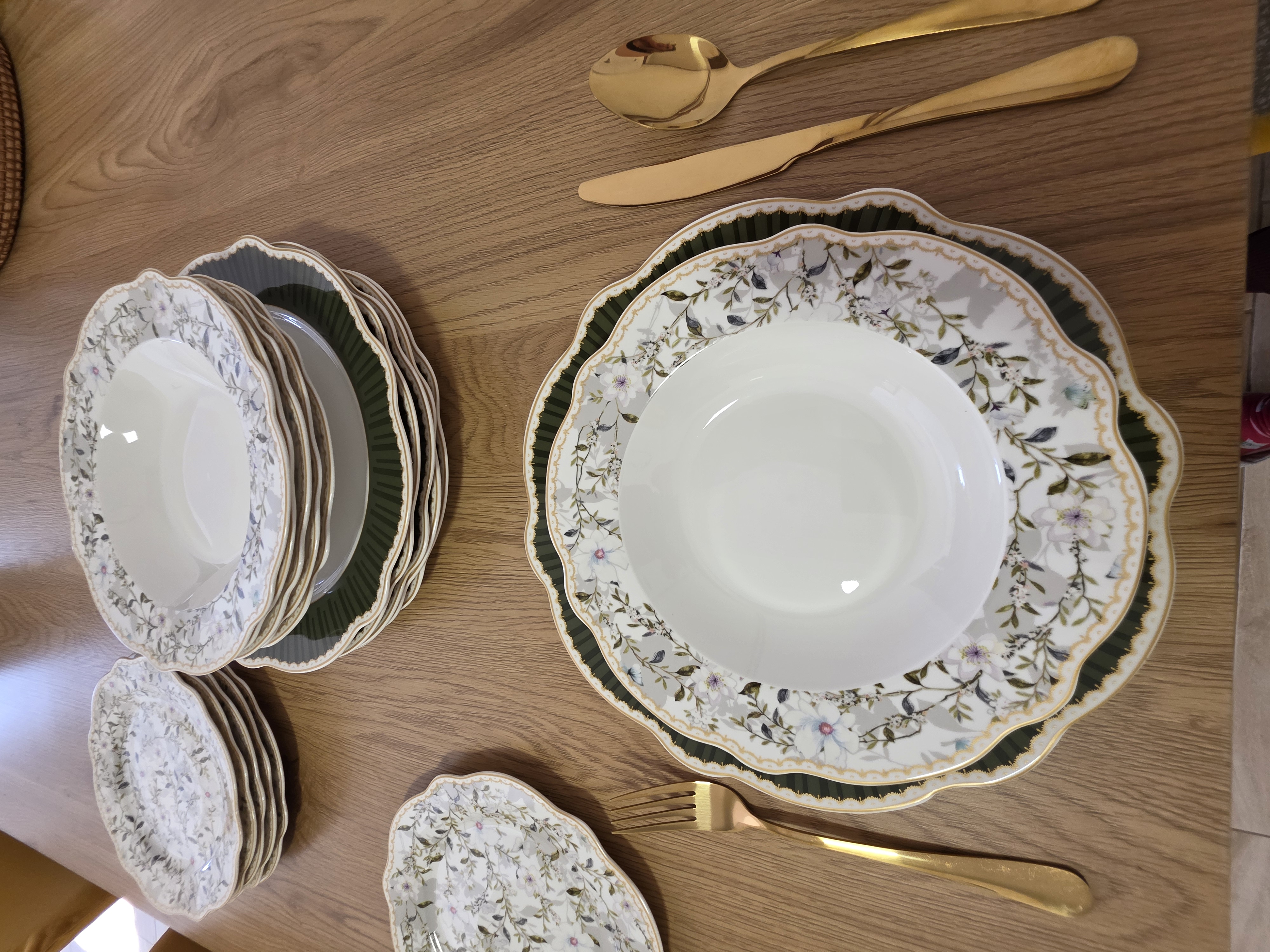 Set izžareva naravno eleganco in prefinjen šarm, zelena obroba in cvetlični detajli pa ustvarjajo občutek svežine in harmonije, zaradi česar je popolna izbira za ljubitelje klasičnega, a sodobnega stila jedilnega servisa.